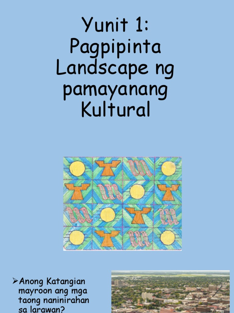 Natutukoy ang pagkakaiba ng mga disenyo na may motif mula sa Luzon Visayas at Mindanao. Pamayanan sa urbanisadong lungsod 69. Disenyong kultural ng pamayanan sa mindanao 1.