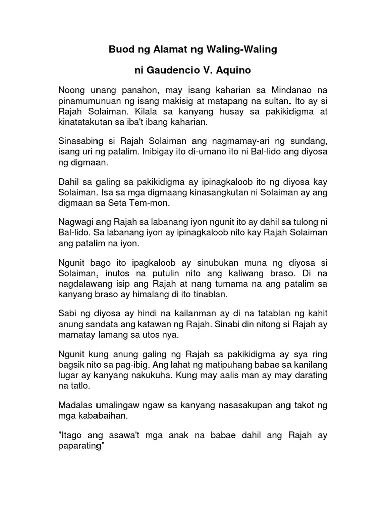 Buod ng mga alamat sa mindanao. Napulot ang sanggol ng isang mangangalakal na si Diyuhara. Napagisip isip ng kambal ang mga sinabi ng Bathala. Alamat ng Pakwan Buod.
